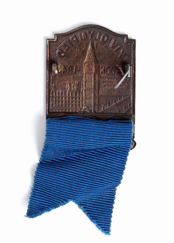 Badge della XIV Olimpiadi di Londra 1948 - In bronzo con nastrino a bandierina azzurro. Ottime condizioni
