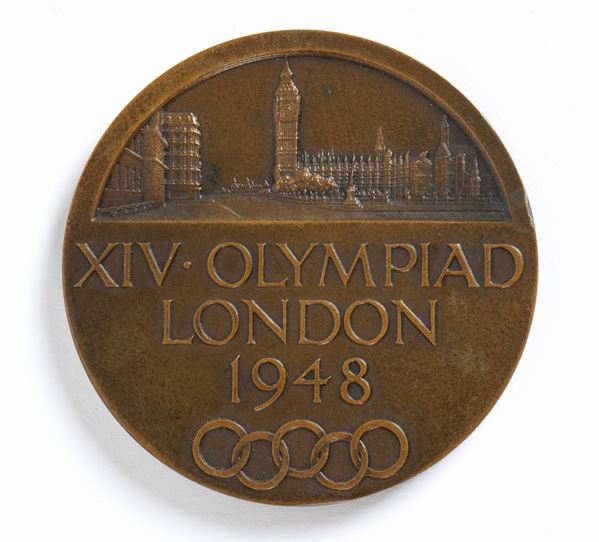 Medaglia di partecipazione alle XIV OLIMPIADI di Londra 1948, in bronzo. Al recto vista della città di Londra sopra la leggenda in tre righe, anelli olimpici nella parte inferiore, al verso quadriga con vincitore trionfante in corsa. Disegno di B. Mackennal / J. Pinches. Buone condizioni, patina del tempo