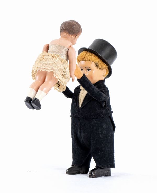 Personaggio della SCHUCO, Germany, ballerino in frac e cappello a cilindro, che solleva con le braccia la ballerina in celluloide MINERVA. Meccanismo con carica a molla. Anni '930. Marcato sui piedi
