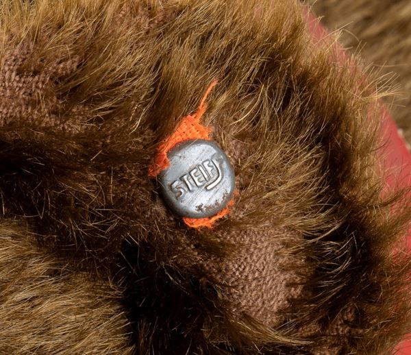 Orso teddy bear, mohair colore marrone, su ruote in legno dipinte di rosso. Bottone metallico con F underscored all'orecchio sinistro dell'orso, rimanenza della targhetta rossa. Originale anni '30. In ottime condizioni