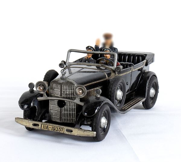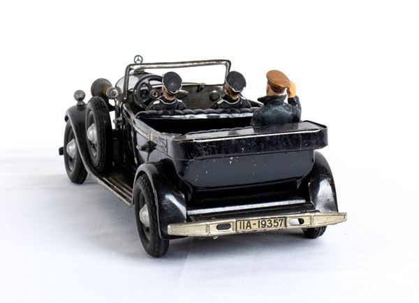 Mercedes Benz 770 di Adolf Hitler prodotta da Tipp & Co (Norimberga, Germania) nel 1937, latta litografata. Giocattolo di propaganda che riproduce la vera decappottabile di lusso utilizzata come veicolo statale da Hitler negli anni '30, con la stessa targa 11A-19357. Meccanismo di carica a molla funzionante, versione con fari elettrici (mediante batteria non fornita), personaggi riprodotti in composizione di due ufficiali nazisti ed Adolf Hitler. Due ruote di scorta laterali, giocattolo in condizioni molto buone, normali segni di gioco e del tempo