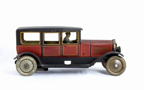 Auto limousine, marcata TIPPCO, targa T.C. 22734. In lamiera litografata, carica a molla, fari elettrici con funzionamento a batteria elettrica, due portiere apribili, ruote sterzanti, parabrezza inclinabile. Autista in livrea. Pneumatici marcati DUNLOP CORD 935x135. Modello lusso