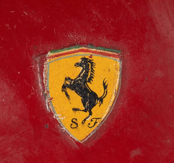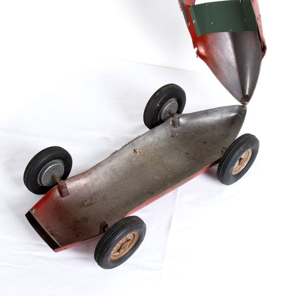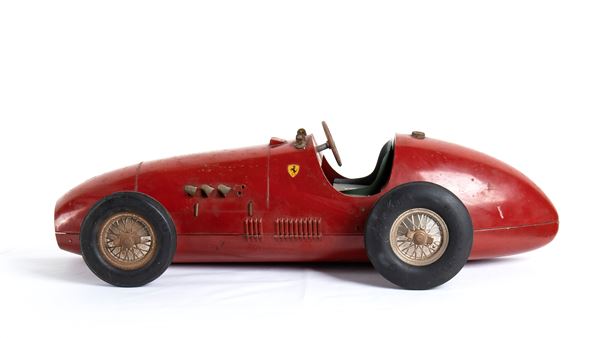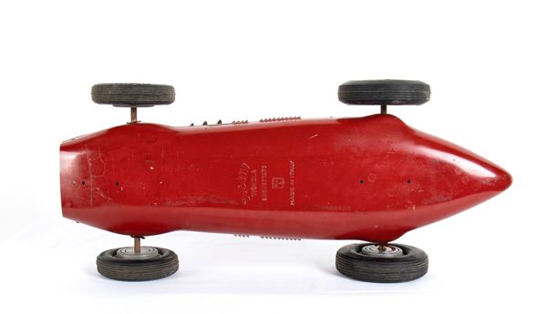 FERRARI 500 della Marchesini Luigi di Bologna (MLB) prodotta per le distillerie TOSCHI Vignola nel 1952. Marcata FONDERPRESS BOLOGNA all'interno della carrozzeria, sul fondo esterno Toschi Vignola Brevettato. Ruote con galletti di bloccaggio, pneumatici marcati PIRELLI. Completa di sterzo e di sedile di guida. Mancante di un tubicino di scappamento laterale, e del parabrezza in celluloide. Vernice originale, tracce di ossidazione sparse, decalcomanie Ferrari originali