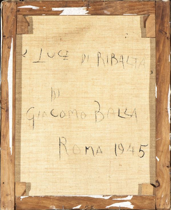 Firmato in basso a destra: Balla; al retro iscrizione postuma: Luce di Ribalta di Giacomo Balla, Roma 1945