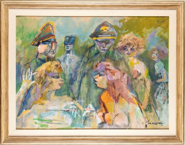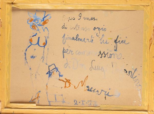 Firmato in basso a destra: Maccari, al retro figure, dedica, firma e data: "Dopo 9 mesi di intenso ozio finalmente lu fici per commissione di Don Luigi Infantino", Maccari, 2 I '77
