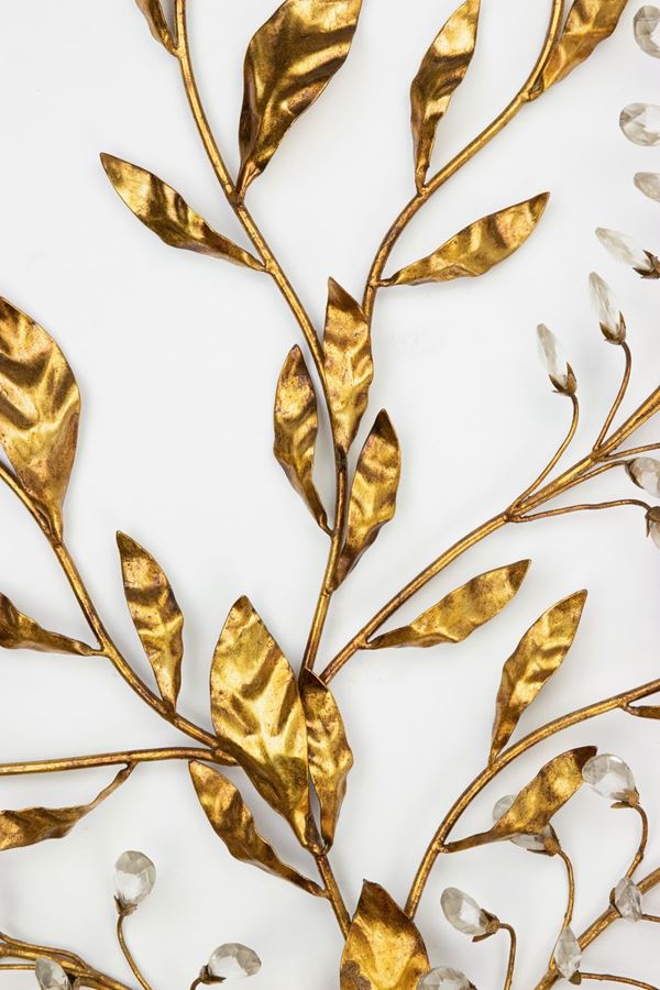 Applique in ottone dorato con gocce di cristallo a forma di fiori. 4 luci.