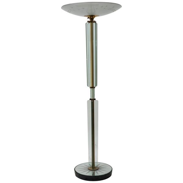 Lampada da terra in vetro tagliato e vetro a specchio, con struttura in ottone e base in legno.