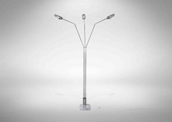 Un'esclusiva lampada da terra cromata con base in marmo e tre luci.