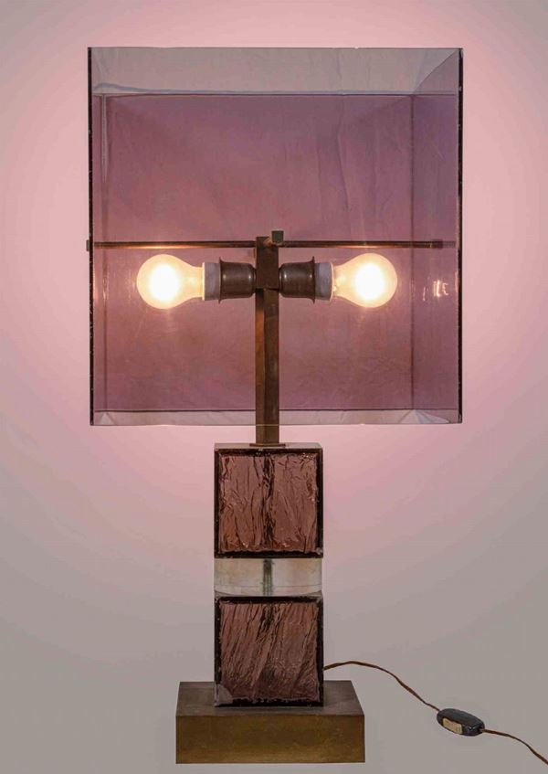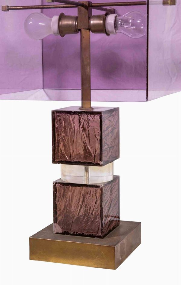 Una lampada vintage unica realizzata in plexiglass, resina e ottone. Dimensioni del paralume 38 x 38 x 38 cm. Base 20x20x5 cm.