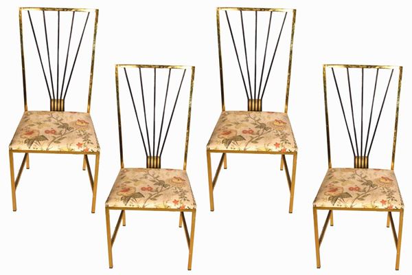 Set di 4 sedie in metallo dorato, metallo ossidato e tessuto imbottito con un bellissimo disegno floreale.