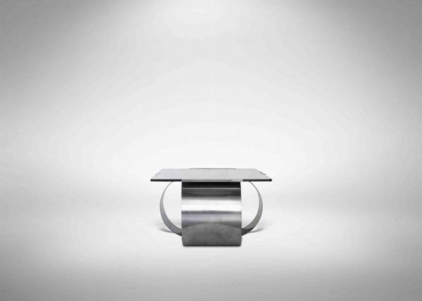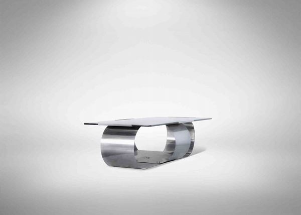 Struttura in acciaio inox spazzolato color argento e sormontata da un ripiano in vetro collegato alla struttura da clip metalliche