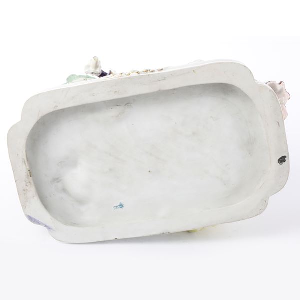 in policromia e base bianca con decoro di fiori in rilievo e decoro in oro zecchino, difetti e mancanze, Marca "n" coronata in blue sotto la base