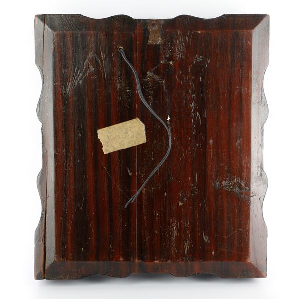con rizza in metallo argentato incisa a motivi geometrici, entro cornice in legno dorato e teca in vetro