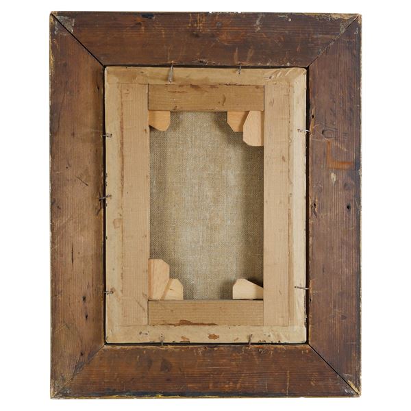 entro cornice in legno e gesso dorato coeva, piccole cadute di colore sul fondo in basso