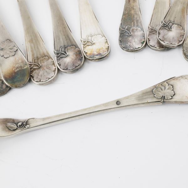 Servizio da pesce con 6 forchette e 6 coltelli in metallo argentato, inizio XX secolo