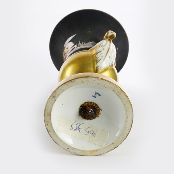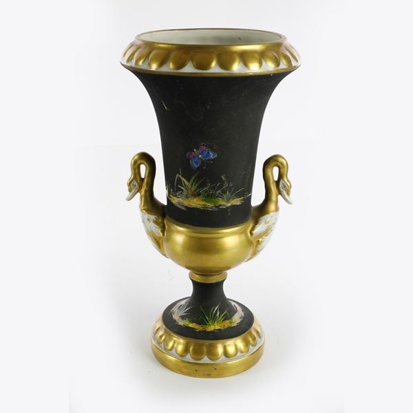 a 2 corpi a forma di calice con anse a forma di cigno e orlo superiore ed inferiore alla base ad ovuli. Decoro con angelo alato farfalle e verdura in policromia su fondo nero finiture in oro zecchino. Manifattura francese con marchio in blu sottosmalto alla base.