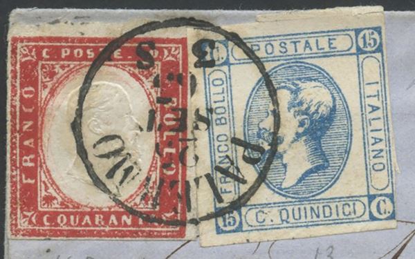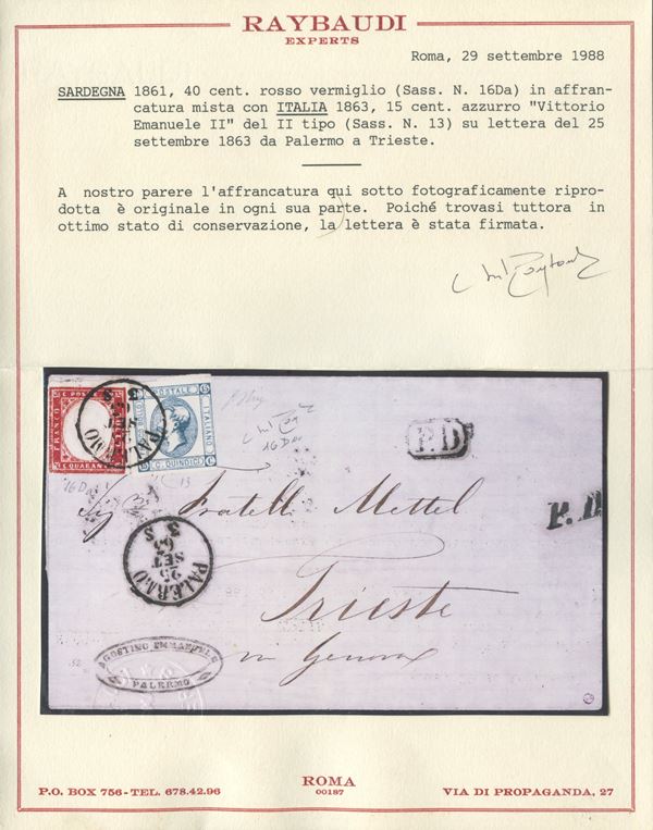 25.09.1862 - Lettera da Palermo per Trieste (All'epoca Austriaca) affrancata per 55 cent. tramite un 40 cent. rosso carminio n.16Da + 15 cent. litografico n.13. Insieme raro. (A) (Cert. Raybaudi, Oliva).