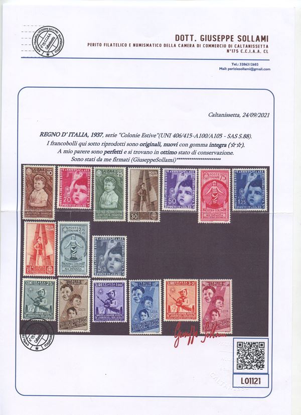 1937 - Colonie Estive n.406/415 + P.A. n.A100/105 nuova con gomma integra. Cert. Sollami.