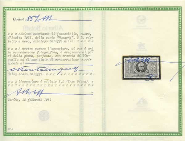 1923 - Mnazoni n. 151/156 nuova con gomma, linguellata. il 5 L. è accompagnato da certificato Bolafffi 85%.