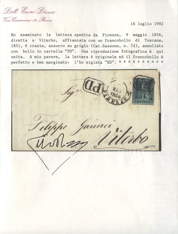 1856 - Lettera da Firenze per Viterbo affrancata tramite un 6 cr. azzurro su grigio n.7d. (LUX) (Cert. Enzo Diena)