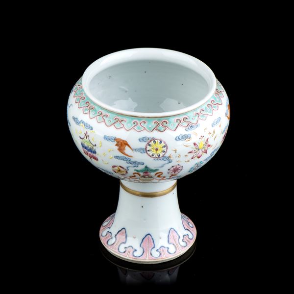 COPPA A STELO IN PORCELLANA CON DECORO A SMALTI POLICROMI