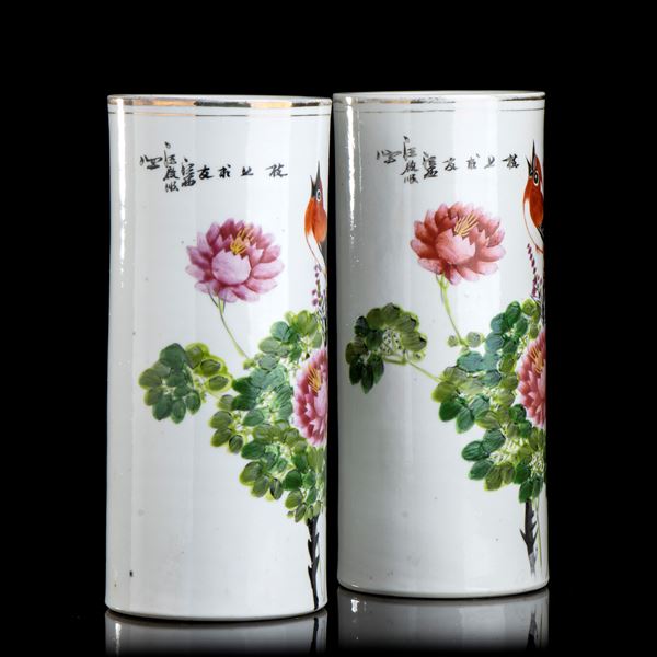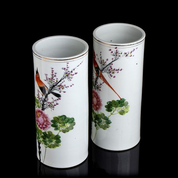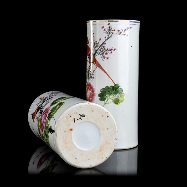 COPPIA DI VASI CILINDRICI IN PORCELLANA CON DECORO A SMALTI POLICROMI