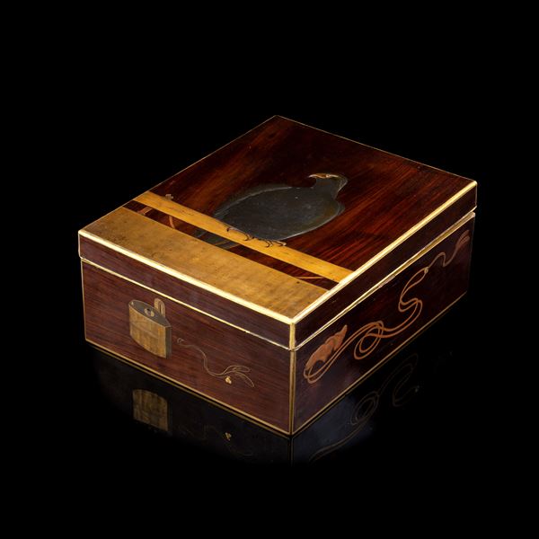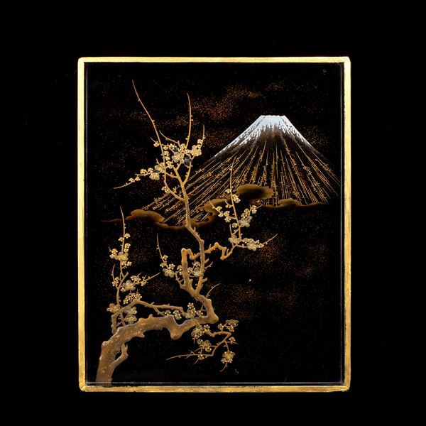 Finemente decorata a oro, sul coperchio un rapace posato su una staccionata, l'interno con una veduta del Monte Fuji.