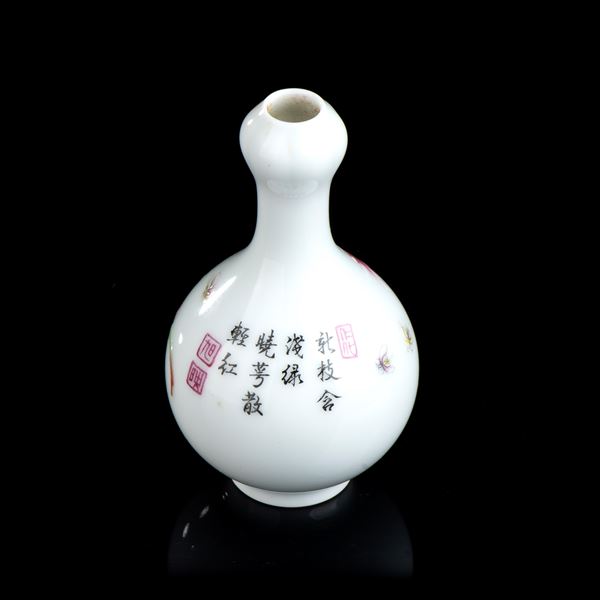 PICCOLO VASO A BOTTIGLIA CON BOCCA A 'TESTA D'AGLIO' IN PORCELLANA CON DECORO A SMALTI POLICROMI