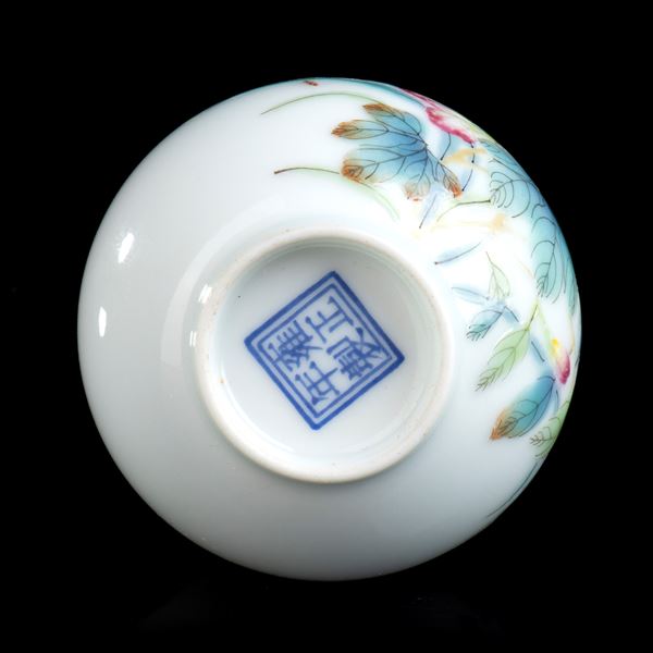 Decorato con una composizione floreale e iscrizione, marchio apocrifo di Yongzheng al centro della base.