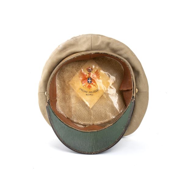 tamburo in panno di lana blu scuro, telino di cotone caki, visiera marrone,fregio in canottiglia dorata e gradi a lastra, all'interno fodera con marchi del fabbricante