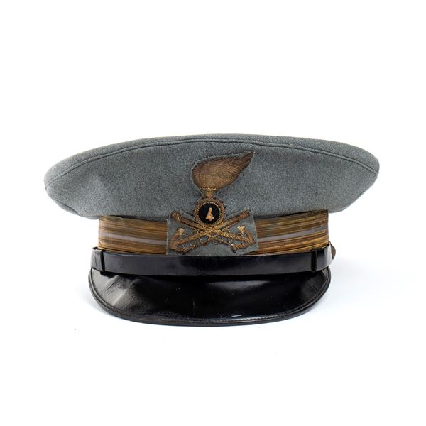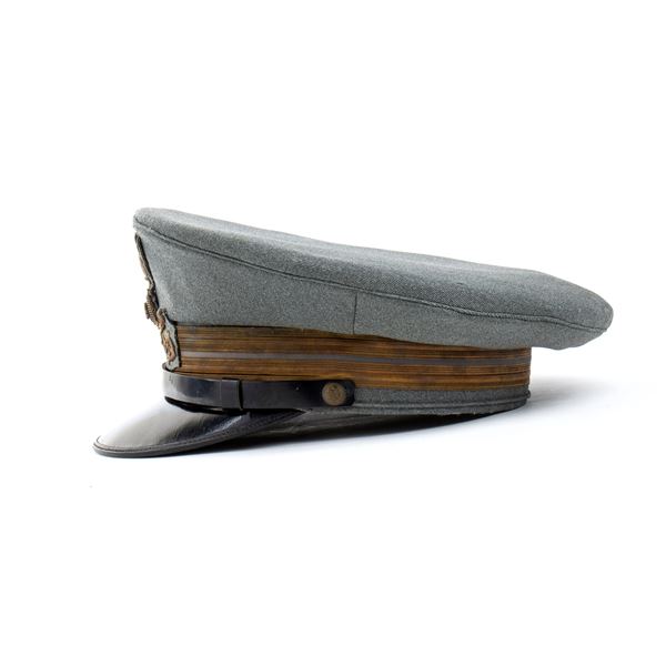 in gabardina grigio, interno di seta con marchi del fabbricante, bel fregio di canottiglia dorata, ottimo stato