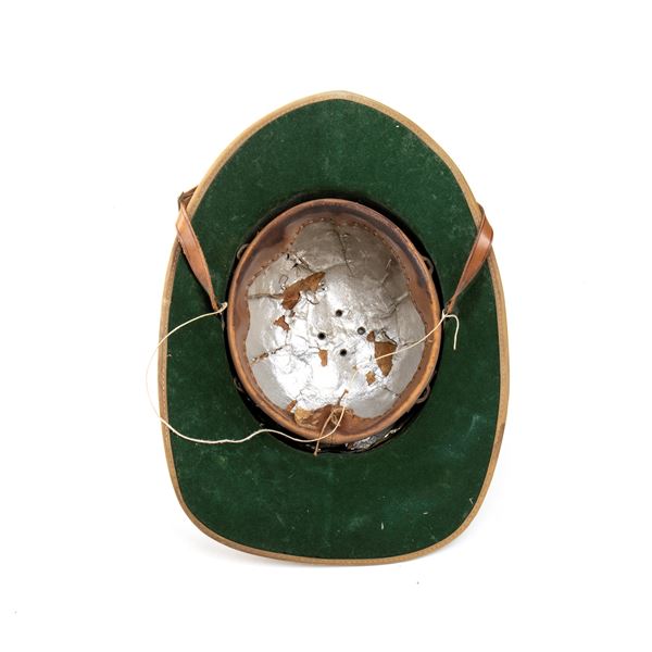 bel casco in feltro ricoperto di tela di cotone caki con fregio frontale metallico, ottimo stato