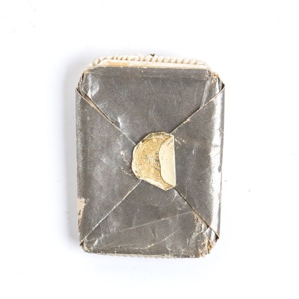 Foto ritratto di Re Vittorio Emanuele III in età matura, montata su cartoncino foderato di seta con applicazioni in metallo bianco, al verso busta in carta argentata con chiudilettera di casa Savoia, invito a corte in occasione del genetliaco del Re, ottimo stato.