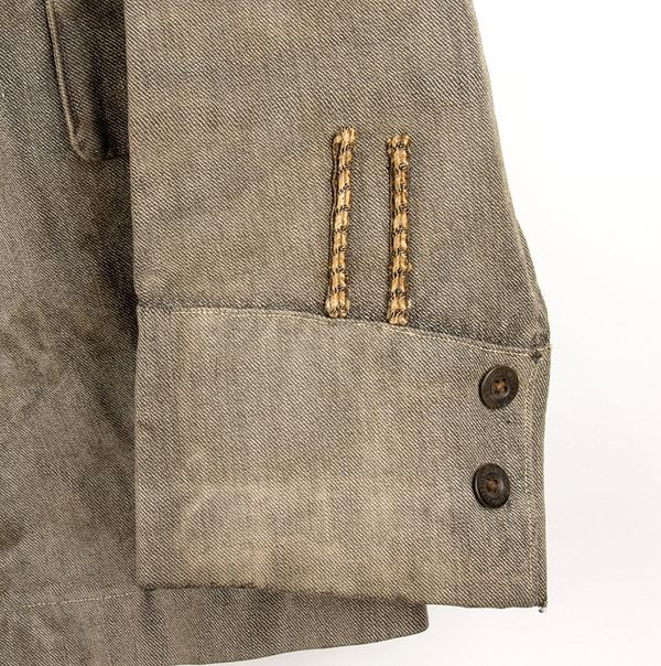 giubba in tela Bigia utilizzata in Libia con mostrine al collo e gradi a bacchetta sulle maniche e distintivo di ferita, in buono stato