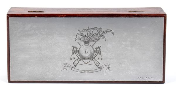Scatola in legno con inciso fregio dell’8° Reggimento Bersaglieri, Militaria...