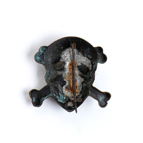 Teschio con tibie n ottone stampato ,al verso spilla verticale in ferro saldato a stagno, fregio usato generalmente dalla GNR ed altri reparti d'elite del Regio esercito e da varie formazioni della RSI, tracce di ossidazione.