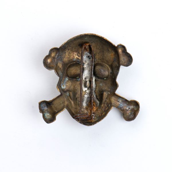 Teschio con tibie n ottone stampato ,al verso spilla verticale in ferro saldato a stagno, fregio usato generalmente dalla GNR ed altri reparti d'elite del Regio esercito e da varie formazioni della RSI, tracce di ossidazione.