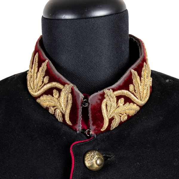 rarissima uniforme del comandante della Guardia Palatina, in castorino di lana turchino scuro , colletto e paramani di velluto amaranto con ricami in canottiglia dorata, due paia di pantaloni, uno con banda oro e uno con banda amaranto, tutto in ottimo stato, molto bella e rara