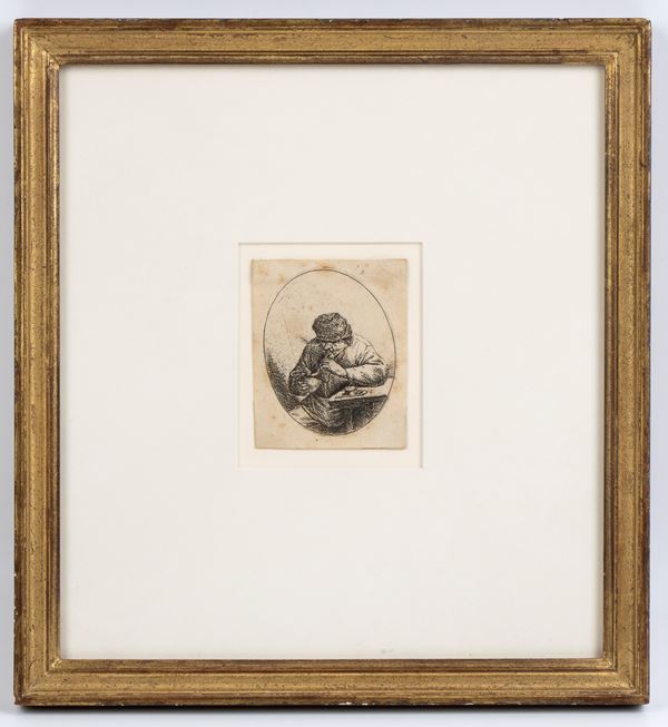 Acquaforte, 68 x 55 mm (lastra); 75 x 61 mm (foglio). Hollstein 5, Bartsch 353. Bella, nitida impressione. Il foglio non è stato esaminato fuori della cornice. Al verso l'ettichietta di Kennedy Galleries, New York.