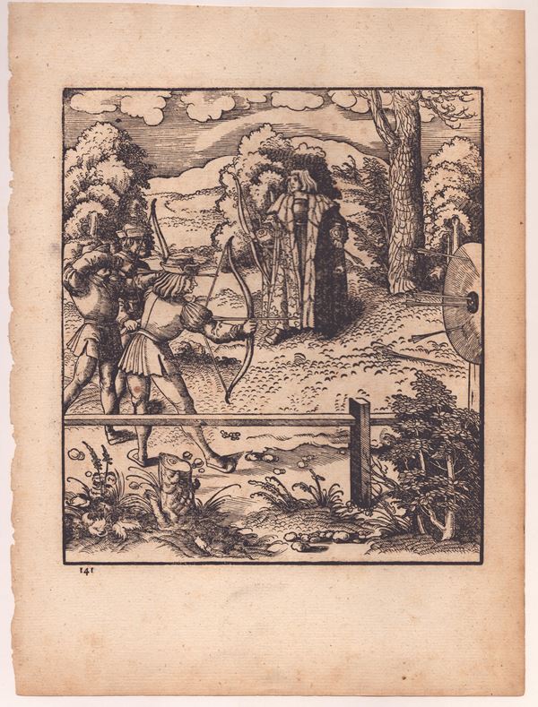 xilografia, 31,7 x 23,7 cm, edizione di Der Weisskinig del 1775, stampata su carta vergata, foglio in buone condizioni salvo lievi bruniture, incollato lungo il margine superiore su passe-partout moderno. Bartsch 80