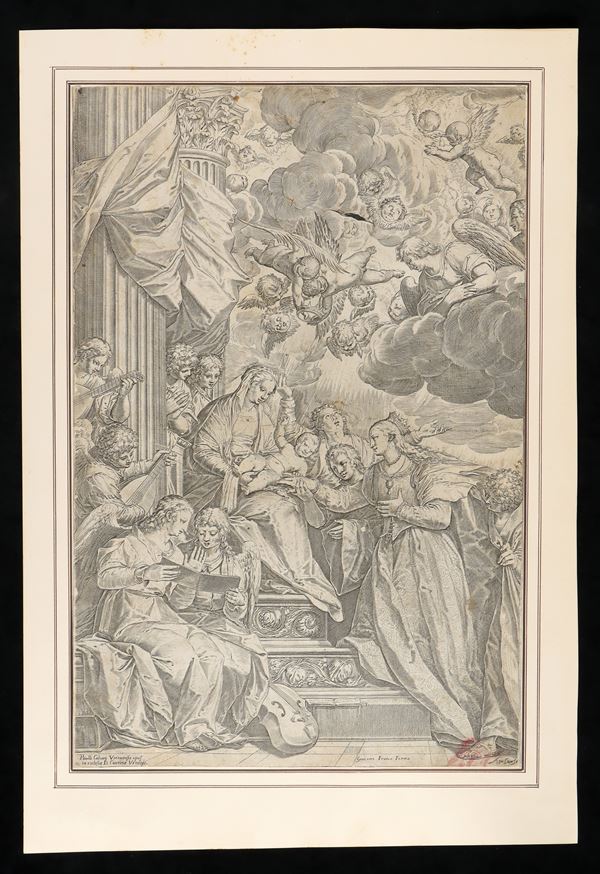 dal dipinto di Paolo Veronese per la chiesa di S. Caterina a Venezia. Acquaforte, 504 x 332 mm. Bohlin 104, stato II su 2, con l'indirizzo di Giacomo Franco (1550-1620).