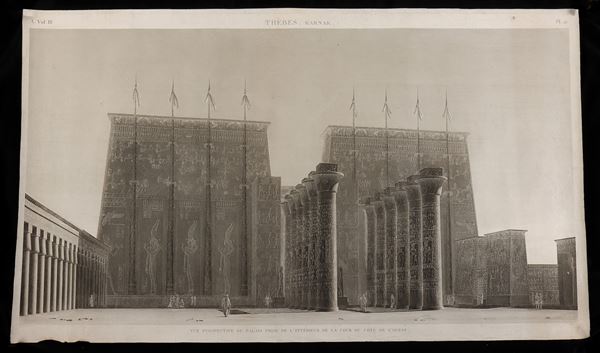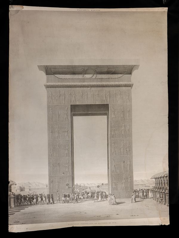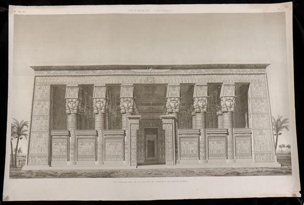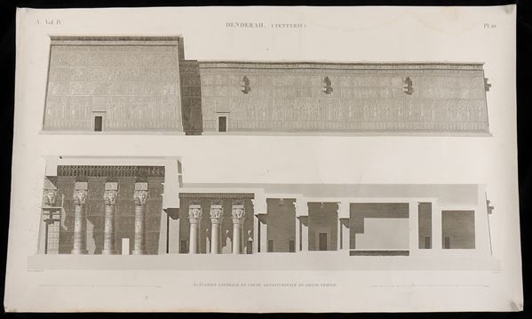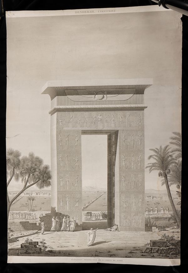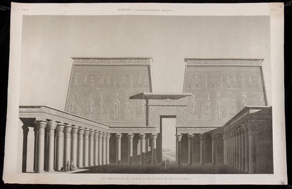 lotto di 6 grandi tavole tratte dall'opera "Description de l'Égypte", raffiguranti Denderah (Tenetyris) – 3 tavole, Thèbes (Karnak) – 2 tavole, Edfoù (Apollinopolis Magna),  DFOU (APOLLINOPOLIS MAGNA). Acquaforte, 67 x 99 cm ca (cad. foglio). In buone condizioni generali.