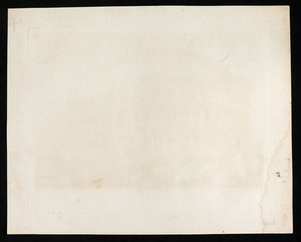 acquaforte e bulino, 370 x 487 mm (lastra); 450 x 565 mm (foglio). Stampata su carta vergellata pesante, una macchia sul margine sinistro, leggerissimi segni di di foxing. Per il resto in ottimo stato.