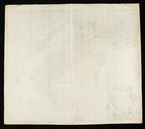bulino e acquaforte, 53,5 x 61 cm. Mappa d'Italia divisa nei stati, da Guillaume de l'Isle. Bella, fresca impressione su due fogli di carta vergata con filigrana uniti. Consueta piega centrale. Bordo inferiore rinforzato al verso. Carta leggermente ossidata. Bella coloritura coeva.