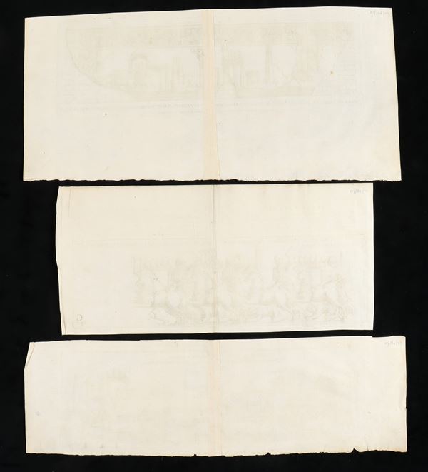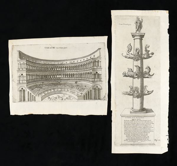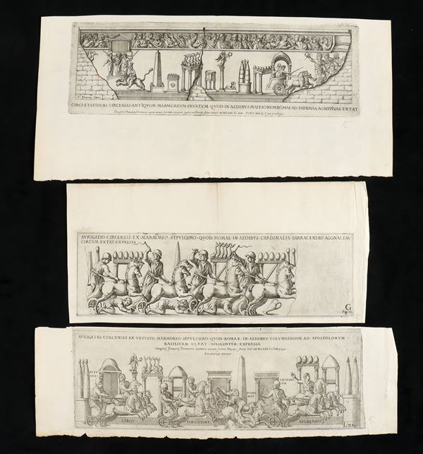 Lotto di 5 incisioni a bulino e acquaforte, varie misure. Tratte da "Onuphrii Panvinii Veronensis, De ludis circensibus, libri II". Bellissime, fresche impressioni su carta vergata sottile con filigrana. Alcuni con consuete pieghe editoriali. In ottimo stato.
