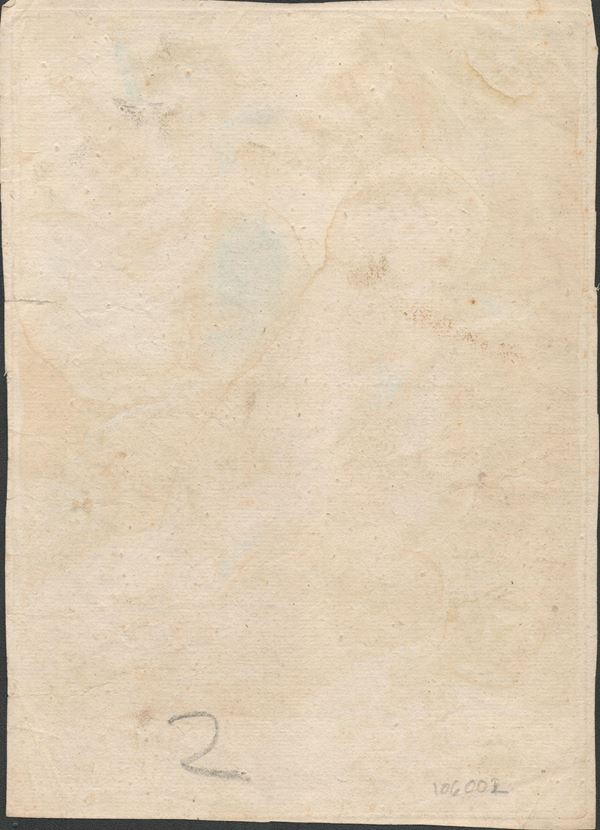acquaforte, 280 x 201 mm, stampata su carta vergata, colorata, piccolissimi margini fuori dalla battuta della lastra, un breve strappo a destra