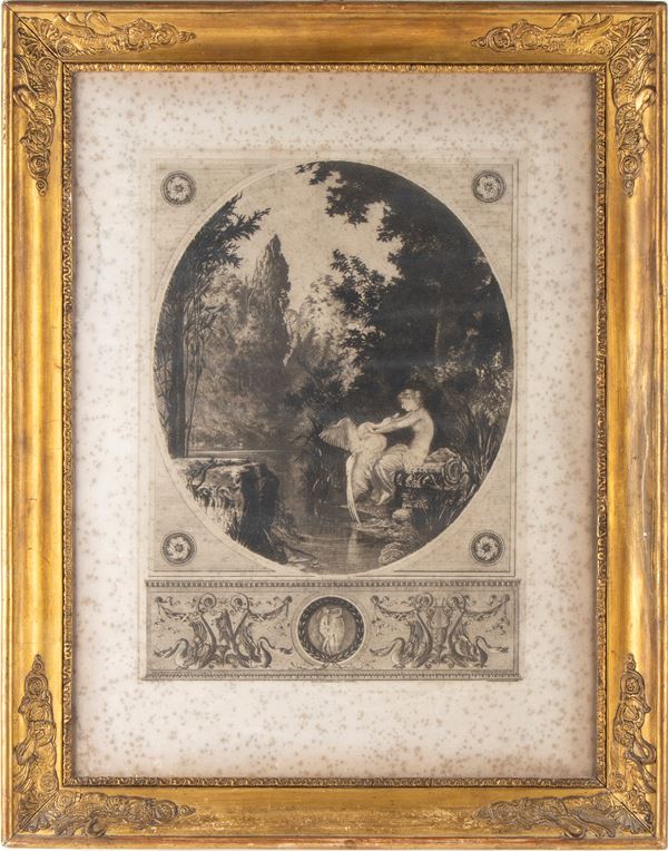 acquaforte e acquatinta, 445 x 315 (lastra); 580 x 480 mm (foglio). Bella, fresca impressione. Foglio brunito, con fioritura sparsa. La stampa non è stata esaminata fuori della cornice (69 x 54 x 3,5 cm).