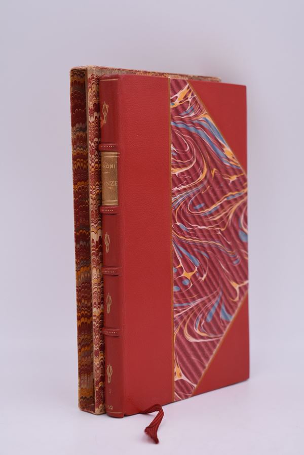 Prima edizione, finito di stampare il 27 Giugno 1952. Premio Viareggio 1952. Legatura artistica in mezza pelle marocchino con angoli, con dorso fregiato, risguardi marmorizzati, taglio dorato, brossura conservata. Con custodia marmorizzata.
