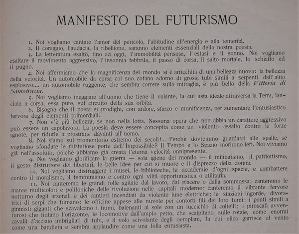 FONDAZIONE E MANIFESTO DEL FUTURISMO. 1909.