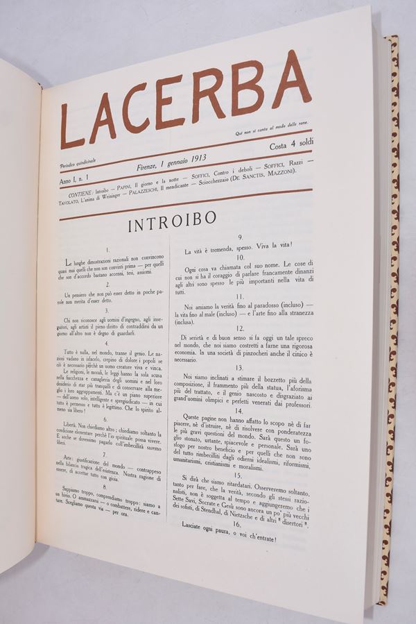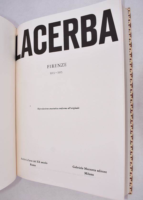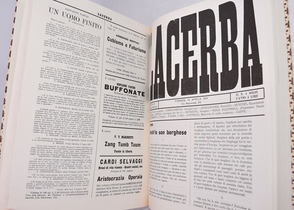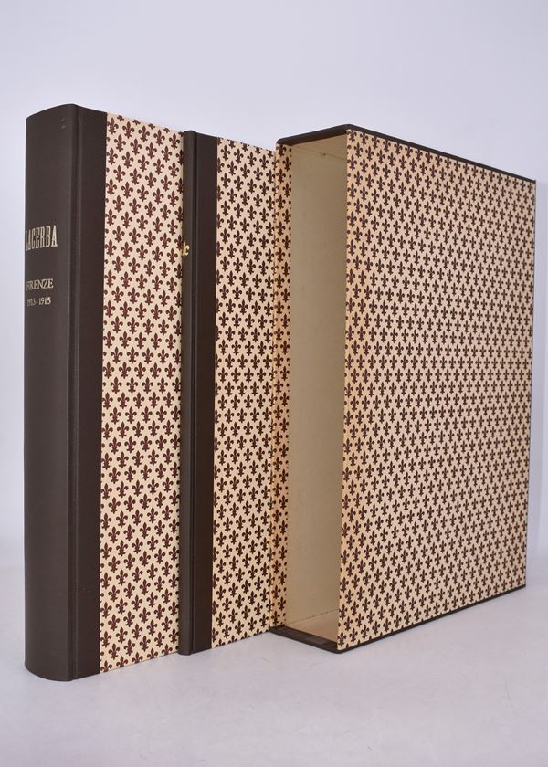 Due volumi illustrati, il primo contenente la “Riproduzione anastatica conforme all’originale” della pubblicazione futurista fondata da Giovanni Papini e Ardengo Soffici, con interventi dei due fondatori, di Palazzeschi, Marinetti e moltissimi altri; il secondo volume propone un testo storico-introduttivo sull’opera ed è a firma di Raffaele Del Garda. Ed. numerata, es. n. 193/700. Legatura in mezza tela e carta decorata a gigli fiorentini, con cofanetto e scheda bibl. conservati.